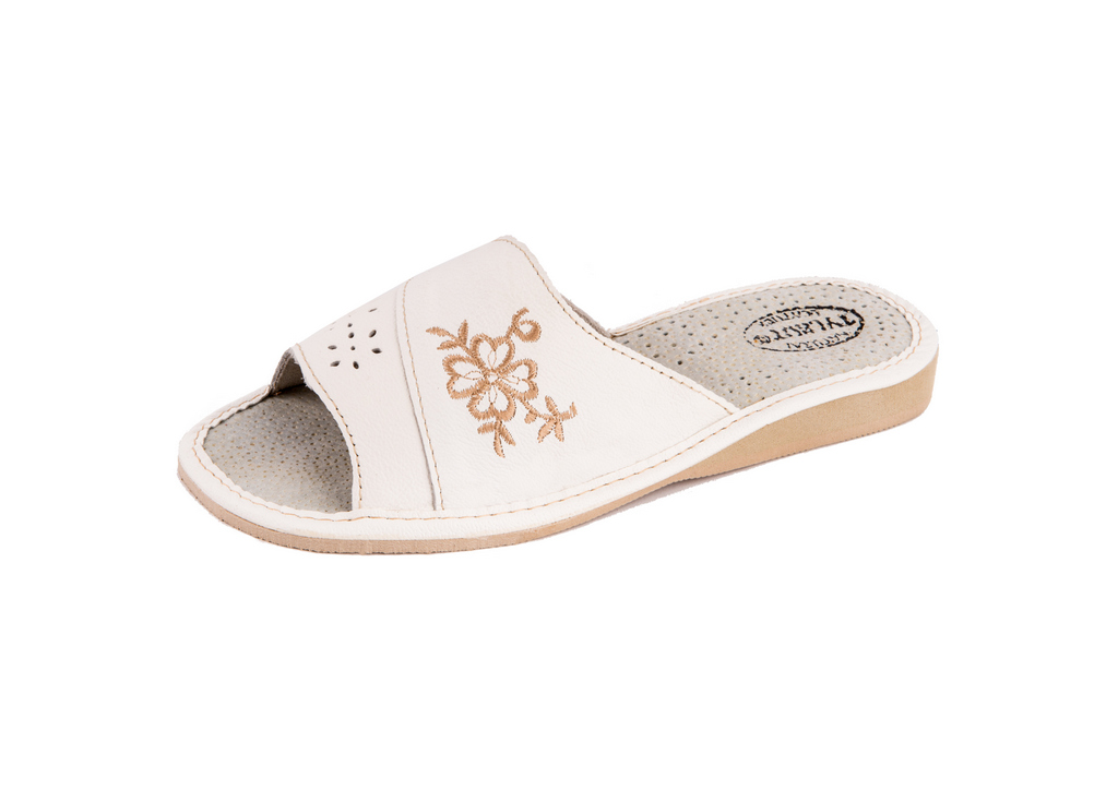 Odkryte haftowane pantofle damskie - to stylowa propozycja dla Pań, które szukają alternatywy dla syntetycznych materiałów. Miękka skóra – klapki damskie wykonane są ze 100 % wysokogatunkowej skóry naturalnej.