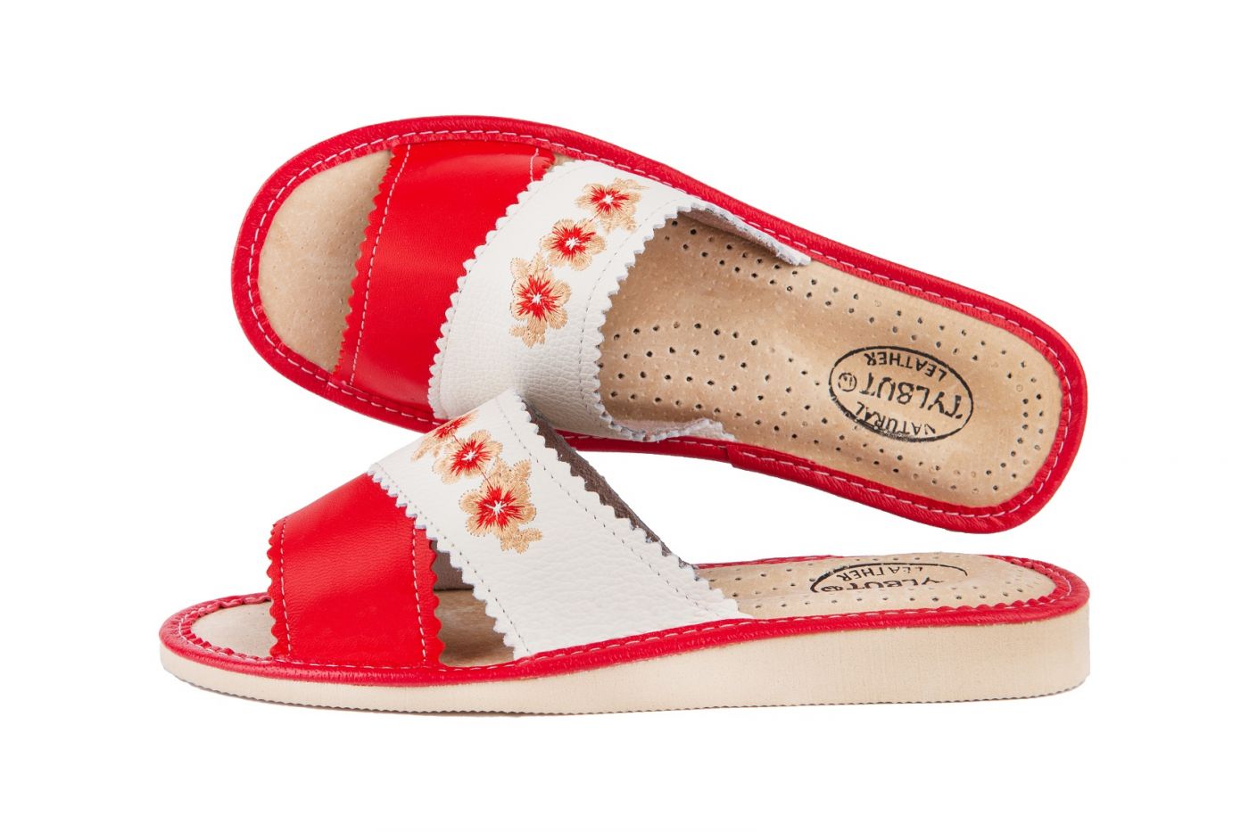Odkryte haftowane pantofle damskie - to stylowa propozycja dla Pań, które szukają alternatywy dla syntetycznych materiałów. Miękka skóra – klapki damskie wykonane są ze 100 % wysokogatunkowej skóry naturalnej.