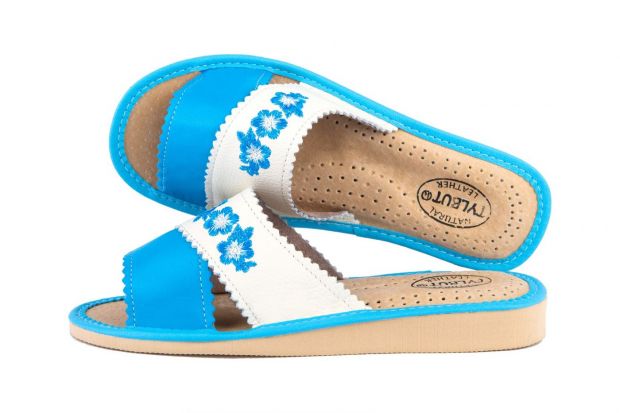 Odkryte haftowane pantofle damskie - to stylowa propozycja dla Pań, które szukają alternatywy dla syntetycznych materiałów. Miękka skóra – klapki damskie wykonane są ze 100 % wysokogatunkowej skóry naturalnej.