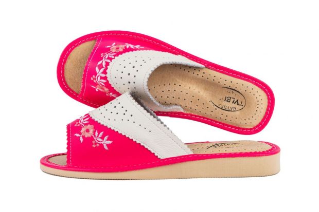 Odkryte haftowane pantofle damskie - to stylowa propozycja dla Pań, które szukają alternatywy dla syntetycznych materiałów. Miękka skóra – klapki damskie wykonane są ze 100 % wysokogatunkowej skóry naturalnej.