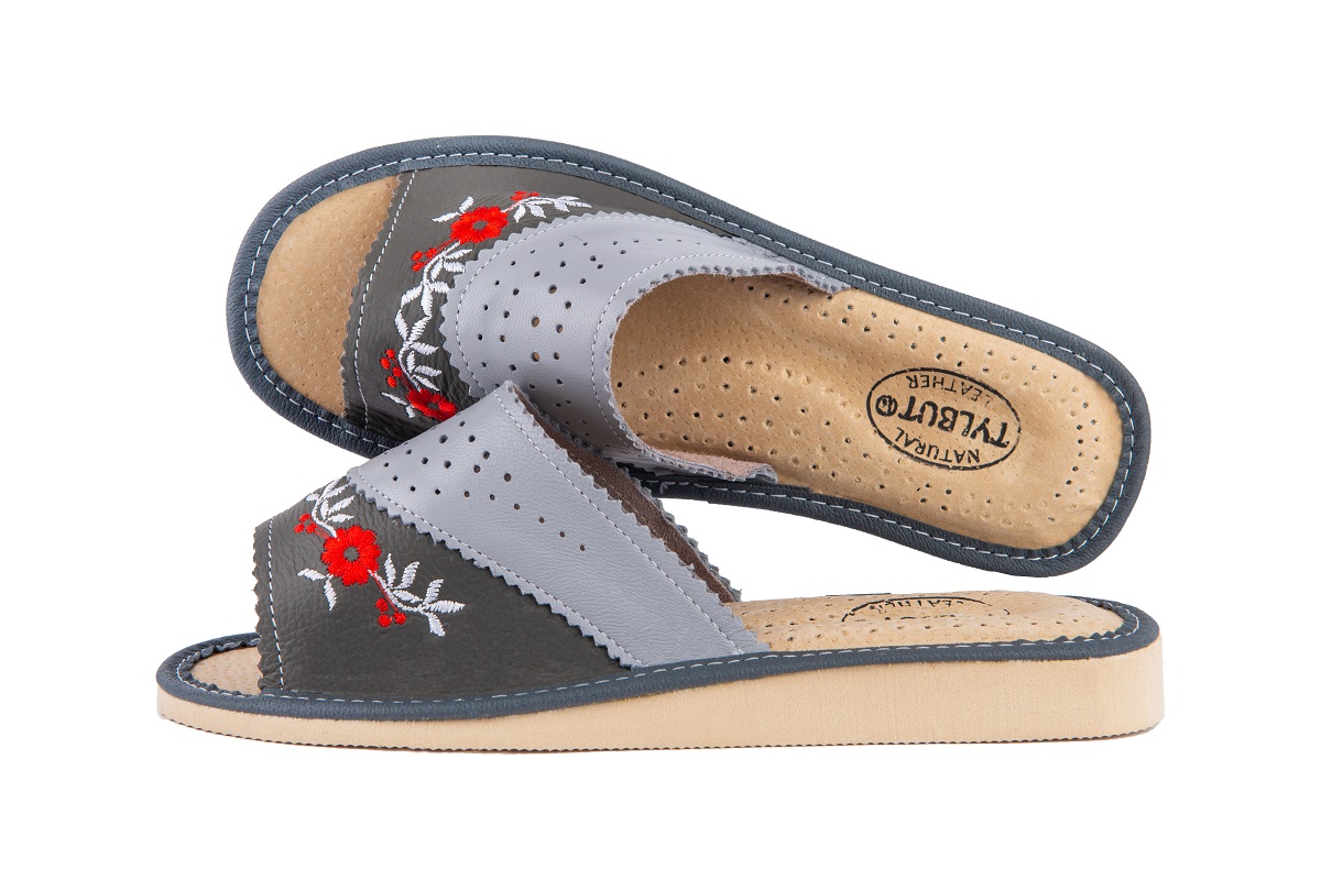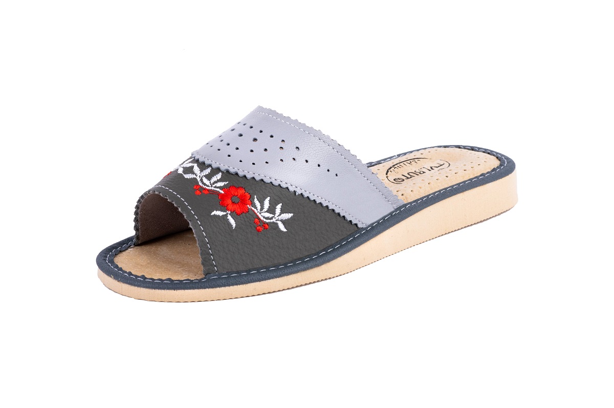 Odkryte haftowane pantofle damskie - to stylowa propozycja dla Pań, które szukają alternatywy dla syntetycznych materiałów. Miękka skóra – klapki damskie wykonane są ze 100 % wysokogatunkowej skóry naturalnej.