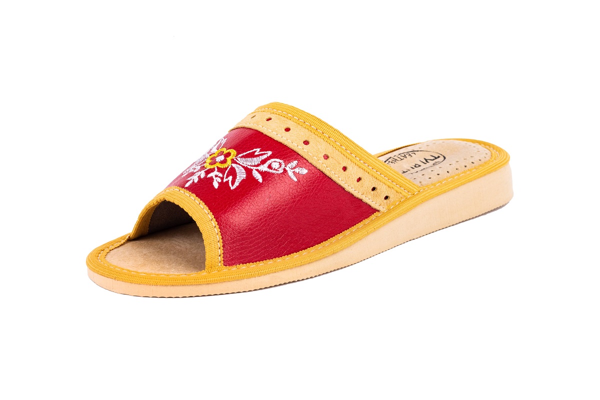 Odkryte haftowane pantofle damskie - to stylowa propozycja dla Pań, które szukają alternatywy dla syntetycznych materiałów. Miękka skóra – klapki damskie wykonane są ze 100 % wysokogatunkowej skóry naturalnej.
