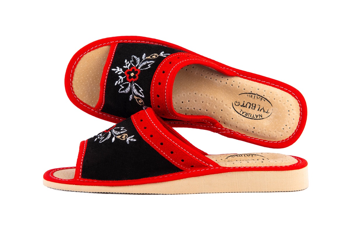 Odkryte haftowane pantofle damskie - to stylowa propozycja dla Pań, które szukają alternatywy dla syntetycznych materiałów. Miękka skóra – klapki damskie wykonane są ze 100 % wysokogatunkowej skóry naturalnej.