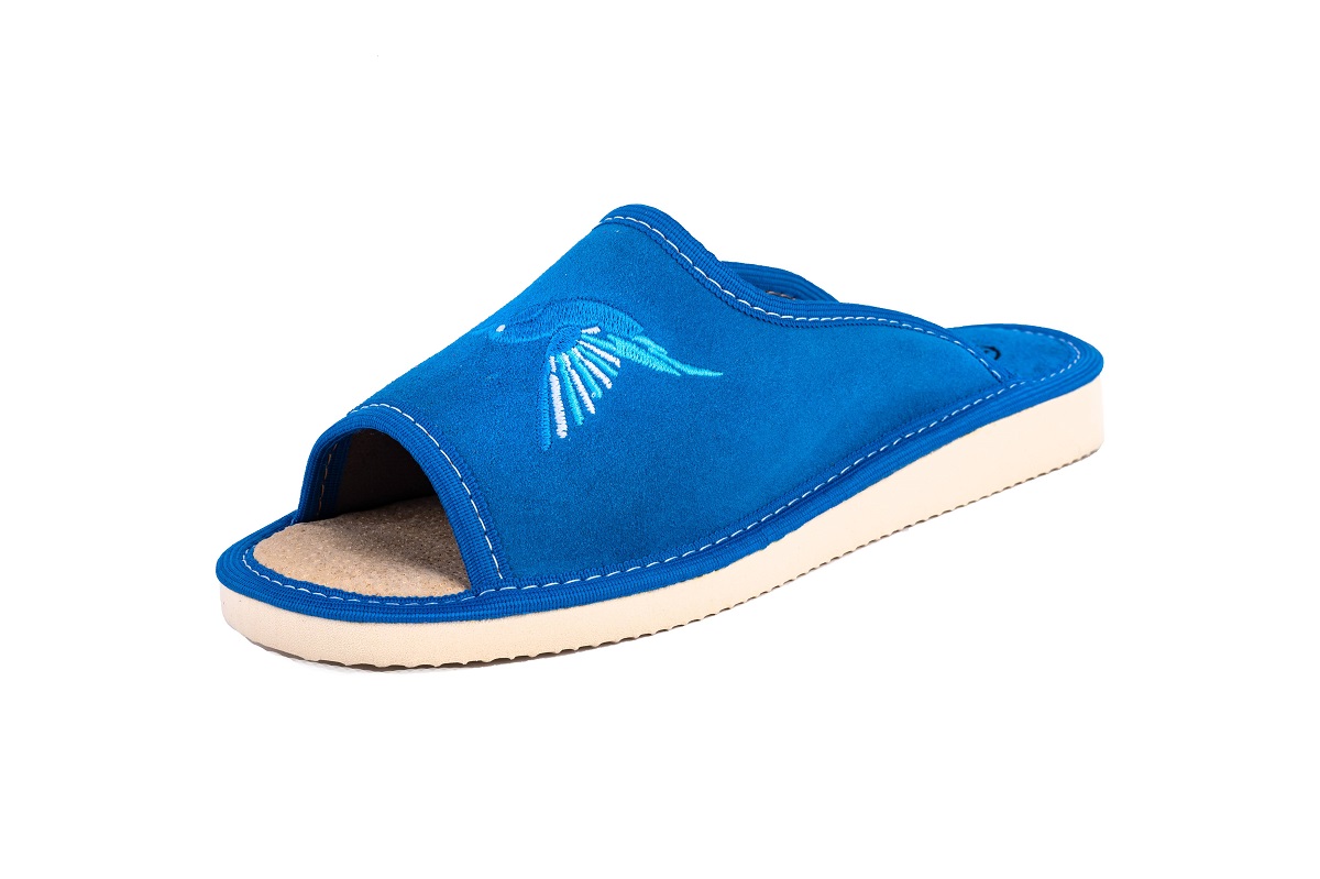 Pantofle damskie wykonane są ze 100 % naturalnej skóry czyniąc je zarówno wytrzymałe jak również eleganckie. Wierzch pantofla wykonany ze skóry zamszowej. Skórzana wkładka jest przyjemna w dotyku oraz utrzymuje Twoje stopy w świeżości w wiosnę i lato.