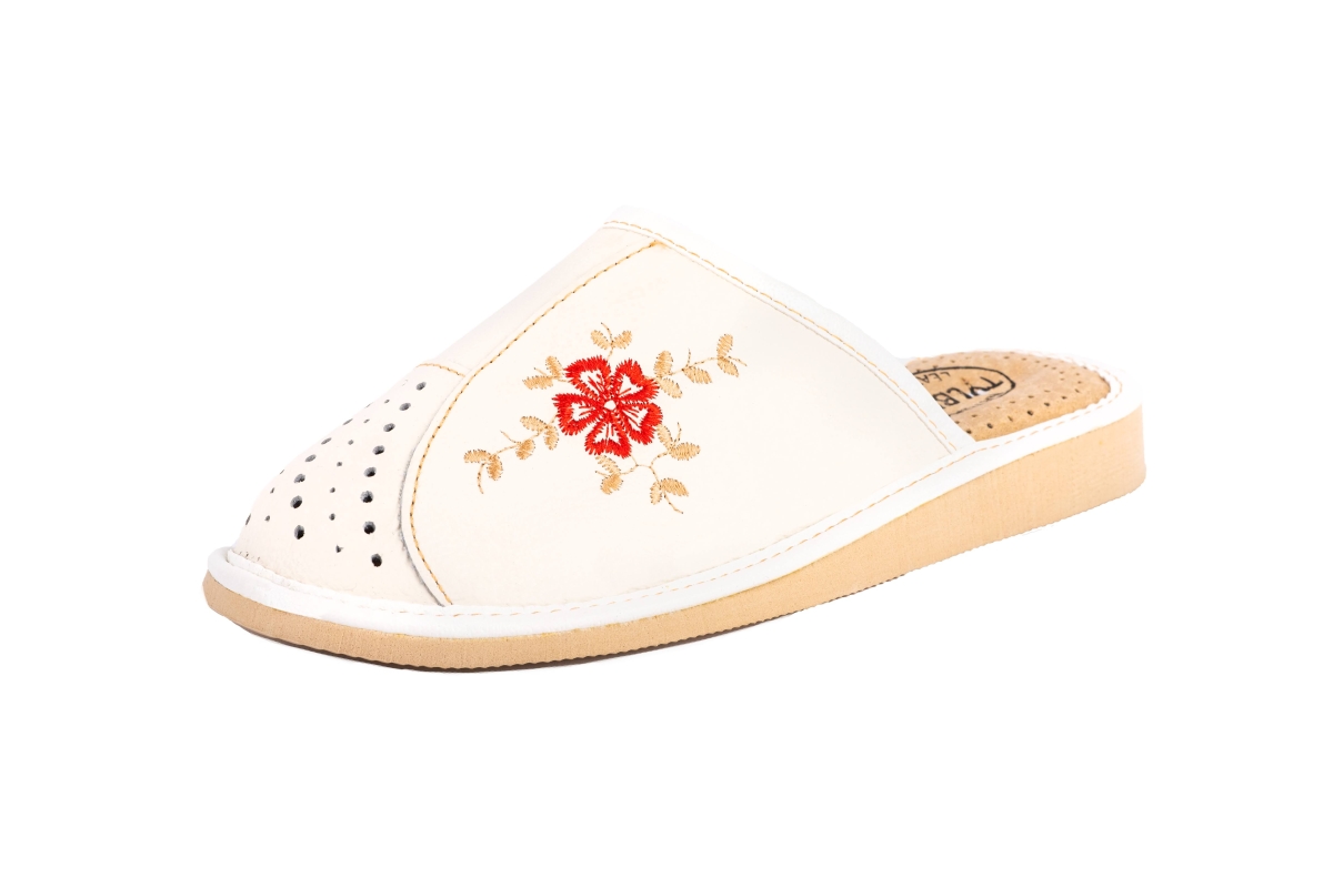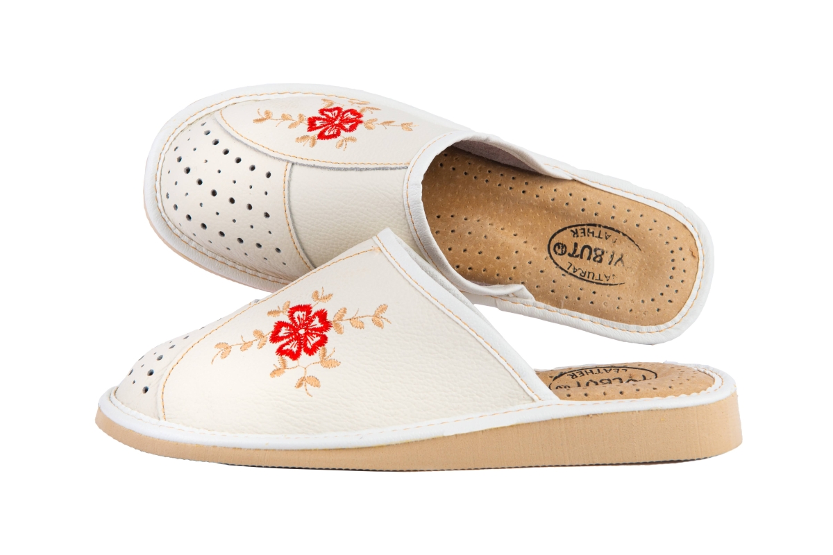 Zakryte haftowane pantofle damskie - to stylowa propozycja dla Pań, które szukają alternatywy dla syntetycznych materiałów. Miękka skóra – klapki damskie wykonane są ze 100 % wysokogatunkowej skóry naturalnej.