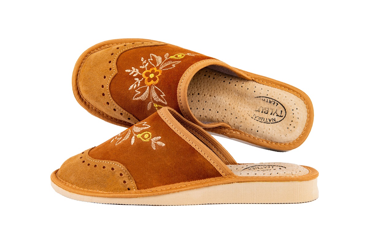 Zakryte haftowane pantofle damskie - to stylowa propozycja dla Pań, które szukają alternatywy dla syntetycznych materiałów. Miękka skóra – klapki damskie wykonane są ze 100 % wysokogatunkowej skóry naturalnej.