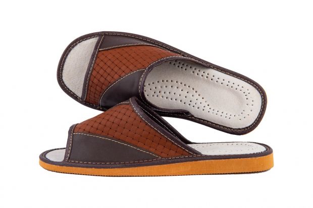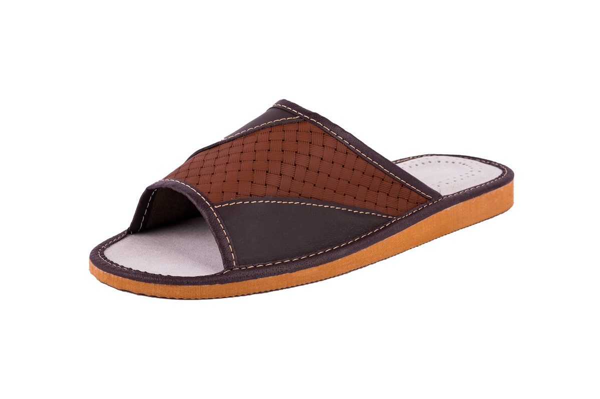 Odkryte tłoczone pantofle męskie- oryginalny styl wyrażony przez tłoczenie inspirowane motywem geometrycznym. Kapcie wykonane z wysoko gatunkowej skóry naturalnej czyniąc je zarówno wytrzymałe jak również eleganckie.