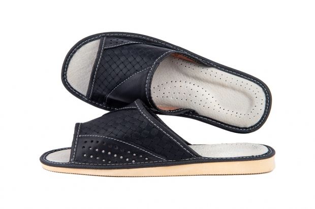 Odkryte tłoczone pantofle męskie- oryginalny styl wyrażony przez tłoczenie inspirowane motywem geometrycznym. Kapcie wykonane z wysoko gatunkowej skóry naturalnej czyniąc je zarówno wytrzymałe jak również eleganckie.