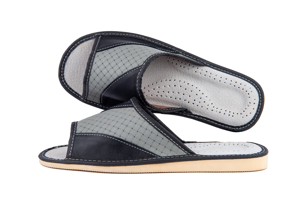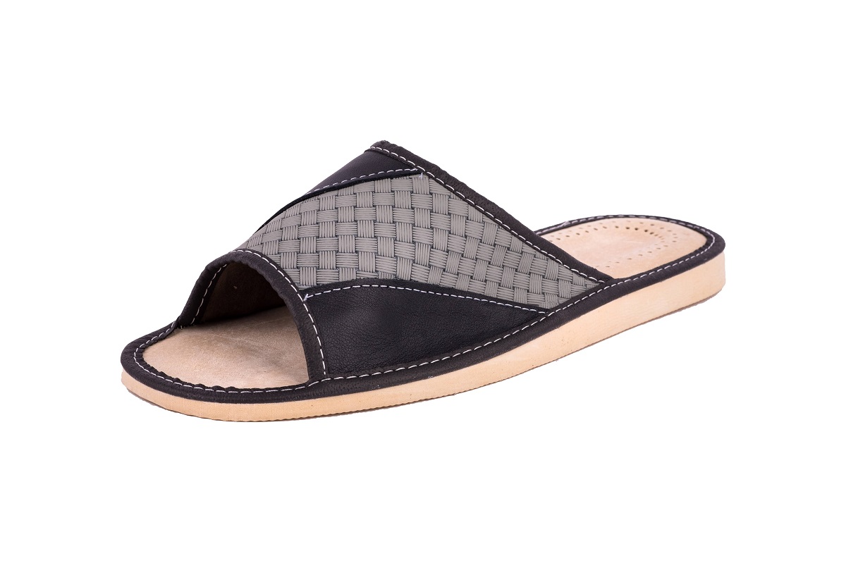 Odkryte tłoczone pantofle męskie- oryginalny styl wyrażony przez tłoczenie inspirowane motywem geometrycznym. Kapcie wykonane z wysoko gatunkowej skóry naturalnej czyniąc je zarówno wytrzymałe jak również eleganckie.