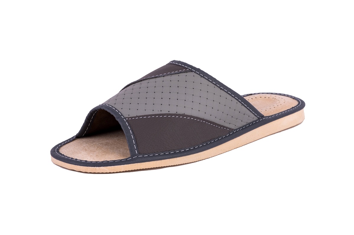 Odkryte tłoczone pantofle męskie- oryginalny styl wyrażony przez tłoczenie inspirowane motywem geometrycznym. Kapcie wykonane z wysoko gatunkowej skóry naturalnej czyniąc je zarówno wytrzymałe jak również eleganckie.