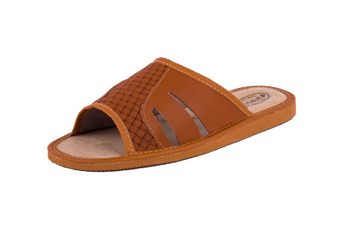 Odkryte tłoczone pantofle męskie- oryginalny styl wyrażony przez tłoczenie inspirowane motywem geometrycznym. Kapcie wykonane z wysoko gatunkowej skóry naturalnej czyniąc je zarówno wytrzymałe jak również eleganckie.