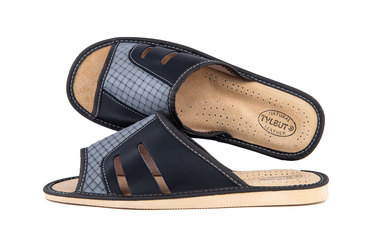 Odkryte tłoczone pantofle męskie- oryginalny styl wyrażony przez tłoczenie inspirowane motywem geometrycznym. Kapcie wykonane z wysoko gatunkowej skóry naturalnej czyniąc je zarówno wytrzymałe jak również eleganckie.