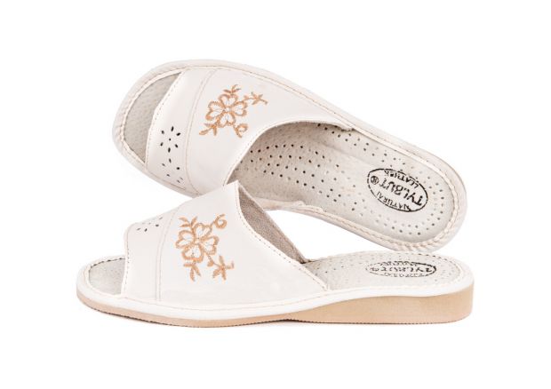 Odkryte haftowane pantofle damskie - to stylowa propozycja dla Pań, które szukają alternatywy dla syntetycznych materiałów. Miękka skóra – klapki damskie wykonane są ze 100 % wysokogatunkowej skóry naturalnej.