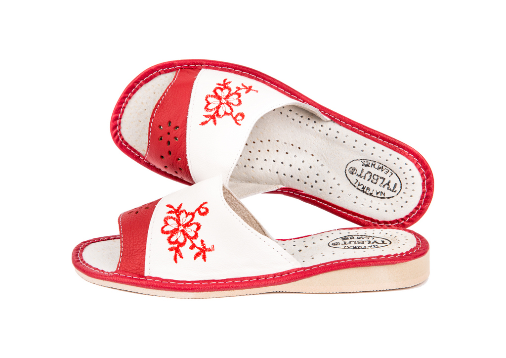 Odkryte haftowane pantofle damskie - to stylowa propozycja dla Pań, które szukają alternatywy dla syntetycznych materiałów. Miękka skóra – klapki damskie wykonane są ze 100 % wysokogatunkowej skóry naturalnej.