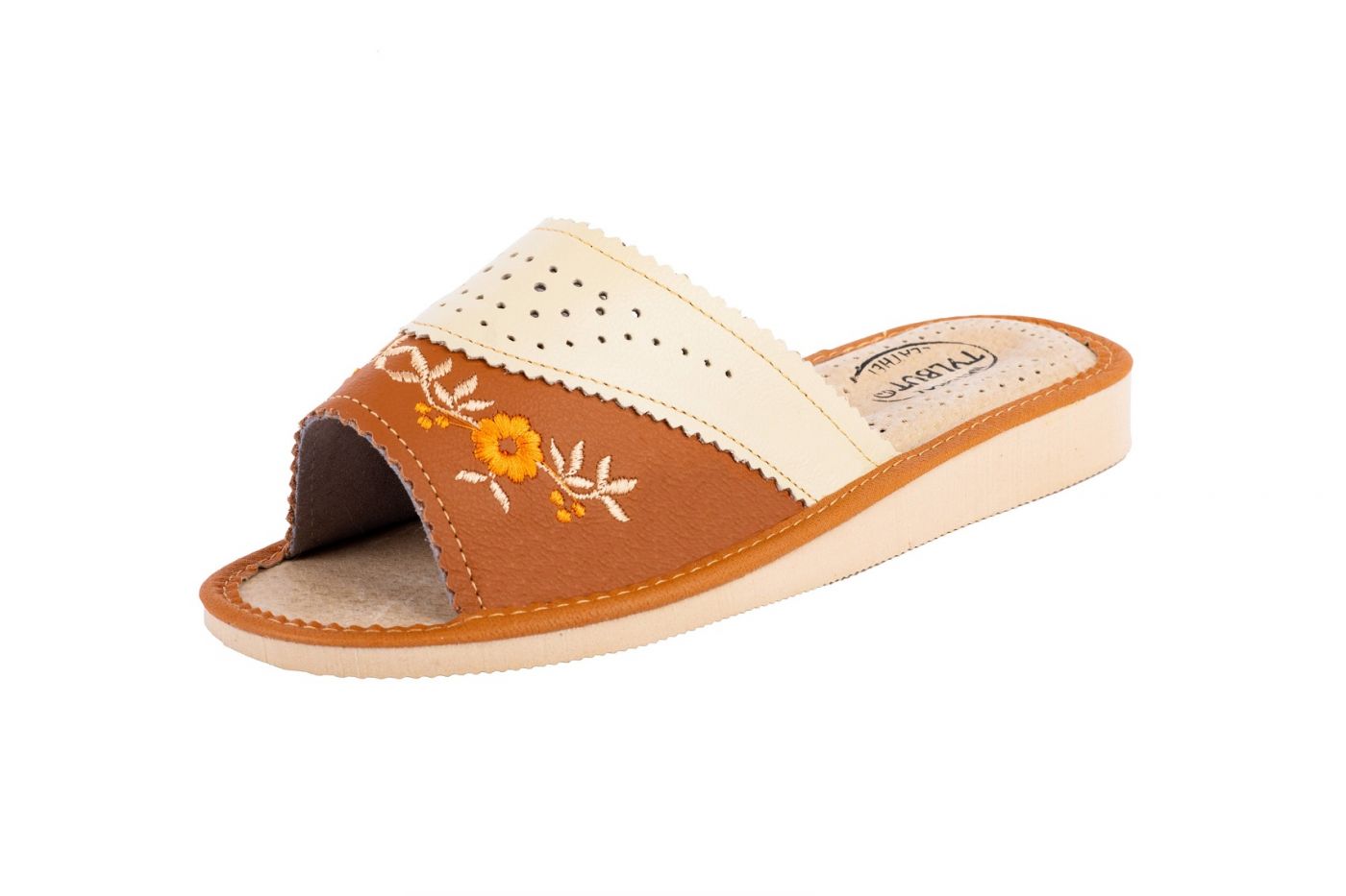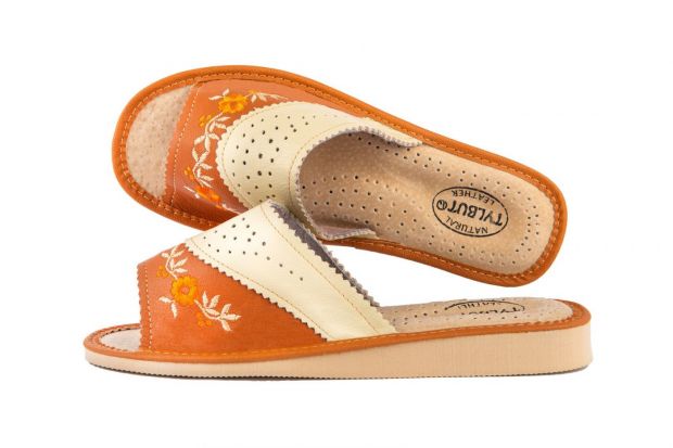 Odkryte haftowane pantofle damskie - to stylowa propozycja dla Pań, które szukają alternatywy dla syntetycznych materiałów. Miękka skóra – klapki damskie wykonane są ze 100 % wysokogatunkowej skóry naturalnej.