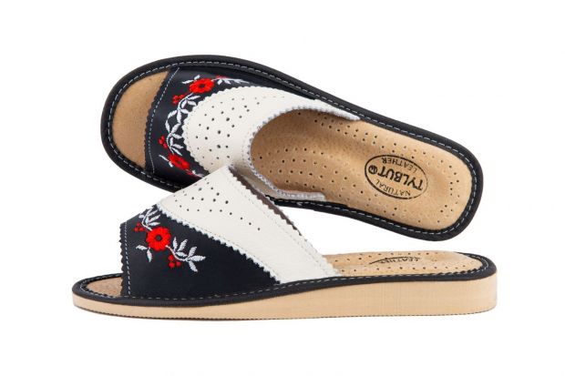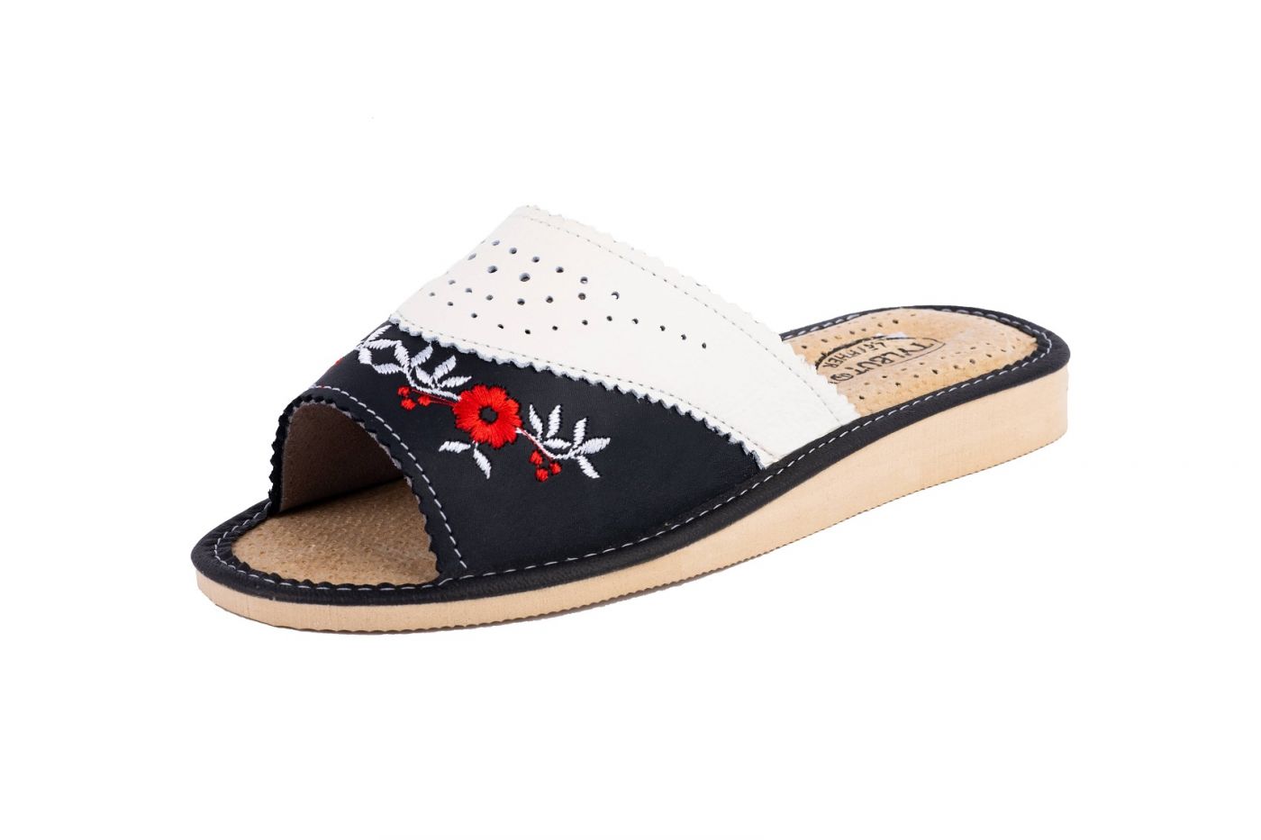 Odkryte haftowane pantofle damskie - to stylowa propozycja dla Pań, które szukają alternatywy dla syntetycznych materiałów. Miękka skóra – klapki damskie wykonane są ze 100 % wysokogatunkowej skóry naturalnej.