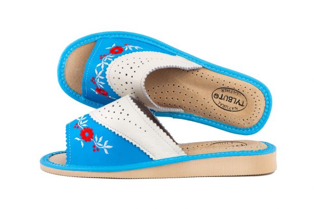 Odkryte haftowane pantofle damskie - to stylowa propozycja dla Pań, które szukają alternatywy dla syntetycznych materiałów. Miękka skóra – klapki damskie wykonane są ze 100 % wysokogatunkowej skóry naturalnej.