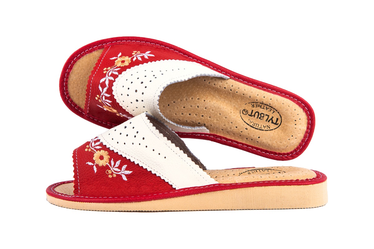 Odkryte haftowane pantofle damskie - to stylowa propozycja dla Pań, które szukają alternatywy dla syntetycznych materiałów. Miękka skóra – klapki damskie wykonane są ze 100 % wysokogatunkowej skóry naturalnej.