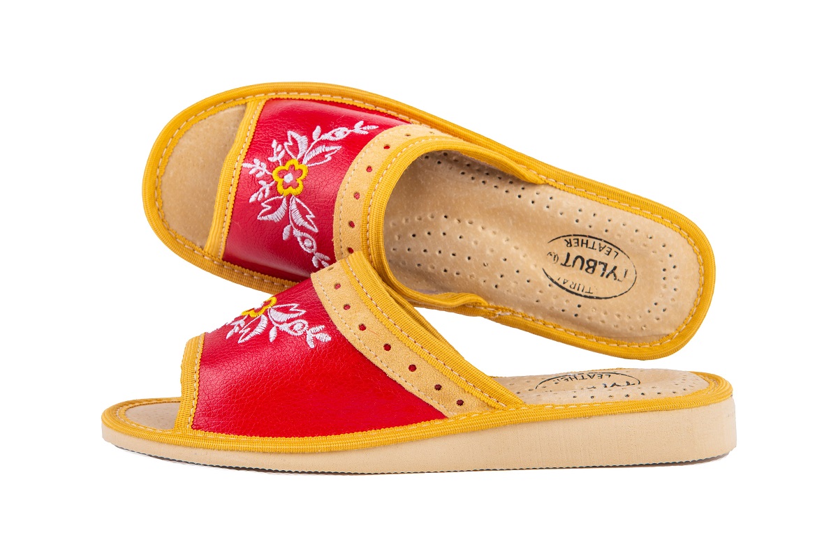 Odkryte haftowane pantofle damskie - to stylowa propozycja dla Pań, które szukają alternatywy dla syntetycznych materiałów. Miękka skóra – klapki damskie wykonane są ze 100 % wysokogatunkowej skóry naturalnej.