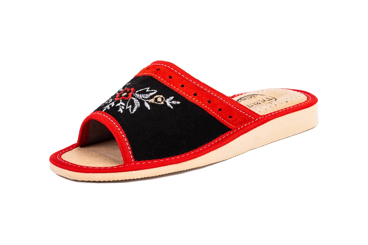 Odkryte haftowane pantofle damskie - to stylowa propozycja dla Pań, które szukają alternatywy dla syntetycznych materiałów. Miękka skóra – klapki damskie wykonane są ze 100 % wysokogatunkowej skóry naturalnej.