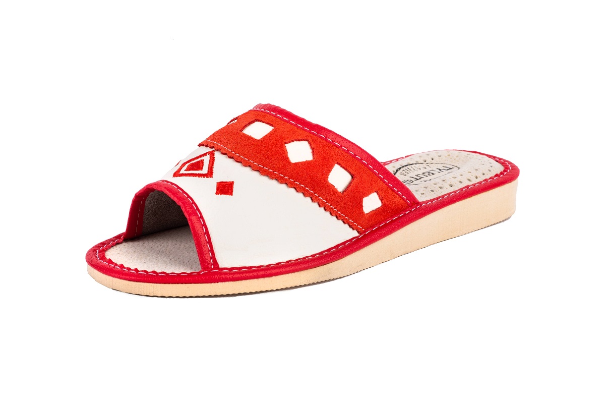 Odkryte haftowane pantofle damskie - to stylowa propozycja dla Pań, które szukają alternatywy dla syntetycznych materiałów. Miękka skóra – klapki damskie wykonane są ze 100 % wysokogatunkowej skóry naturalnej.
