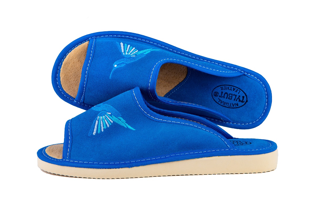 Pantofle damskie wykonane są ze 100 % naturalnej skóry czyniąc je zarówno wytrzymałe jak również eleganckie. Wierzch pantofla wykonany ze skóry zamszowej. Skórzana wkładka jest przyjemna w dotyku oraz utrzymuje Twoje stopy w świeżości w wiosnę i lato.