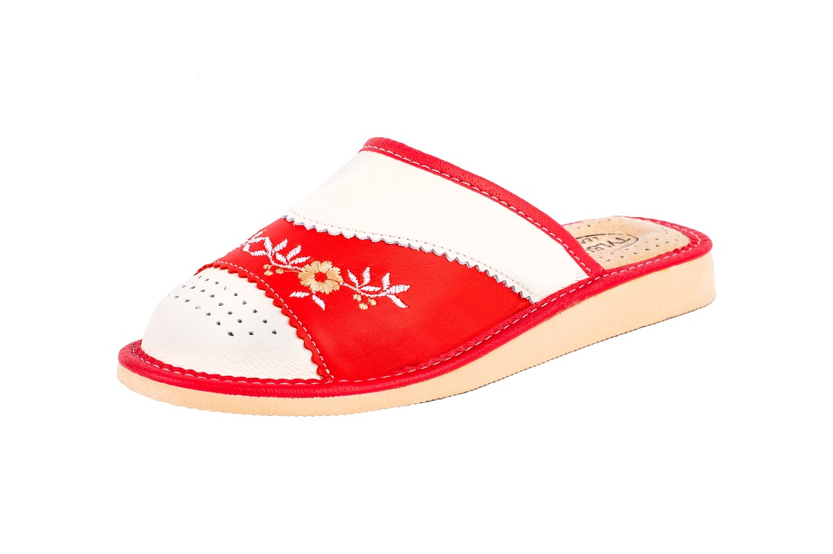 Zakryte haftowane pantofle damskie - to stylowa propozycja dla Pań, które szukają alternatywy dla syntetycznych materiałów. Miękka skóra – klapki damskie wykonane są ze 100 % wysokogatunkowej skóry naturalnej.