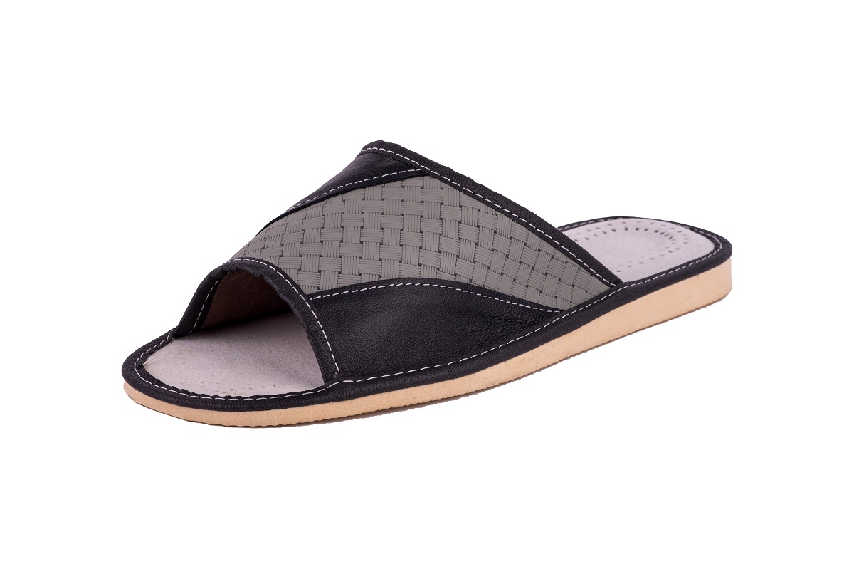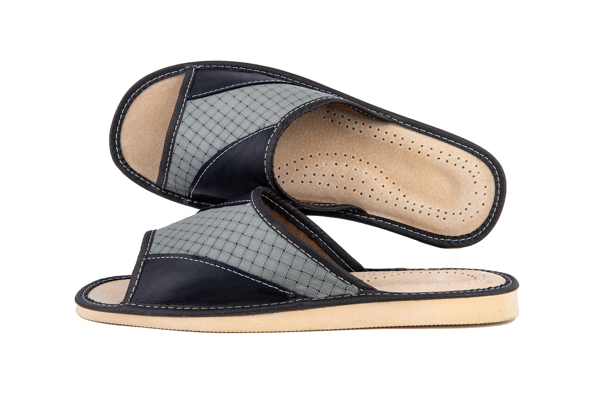 Odkryte tłoczone pantofle męskie- oryginalny styl wyrażony przez tłoczenie inspirowane motywem geometrycznym. Kapcie wykonane z wysoko gatunkowej skóry naturalnej czyniąc je zarówno wytrzymałe jak również eleganckie.