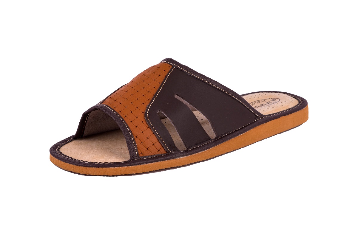Odkryte tłoczone pantofle męskie- oryginalny styl wyrażony przez tłoczenie inspirowane motywem geometrycznym. Kapcie wykonane z wysoko gatunkowej skóry naturalnej czyniąc je zarówno wytrzymałe jak również eleganckie.
