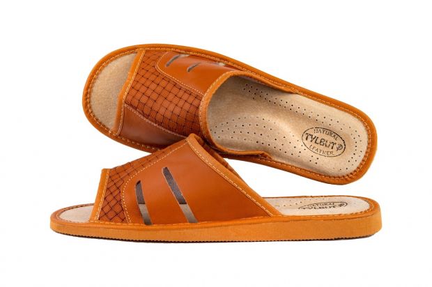 Odkryte tłoczone pantofle męskie- oryginalny styl wyrażony przez tłoczenie inspirowane motywem geometrycznym. Kapcie wykonane z wysoko gatunkowej skóry naturalnej czyniąc je zarówno wytrzymałe jak również eleganckie.