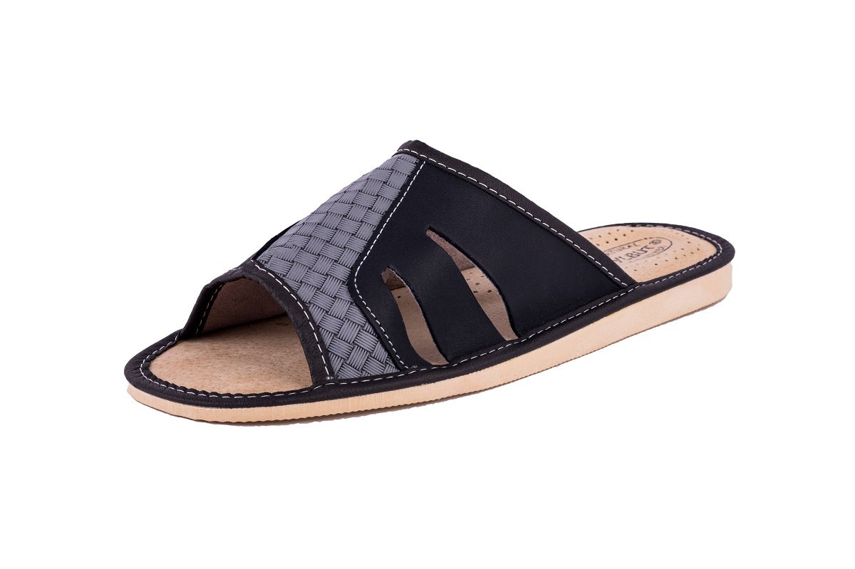 Odkryte tłoczone pantofle męskie- oryginalny styl wyrażony przez tłoczenie inspirowane motywem geometrycznym. Kapcie wykonane z wysoko gatunkowej skóry naturalnej czyniąc je zarówno wytrzymałe jak również eleganckie.